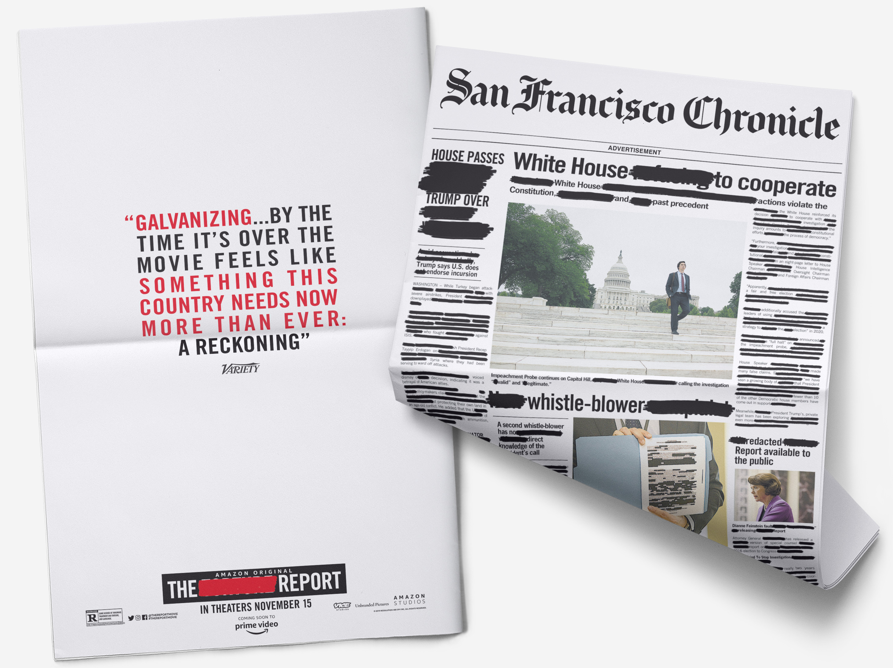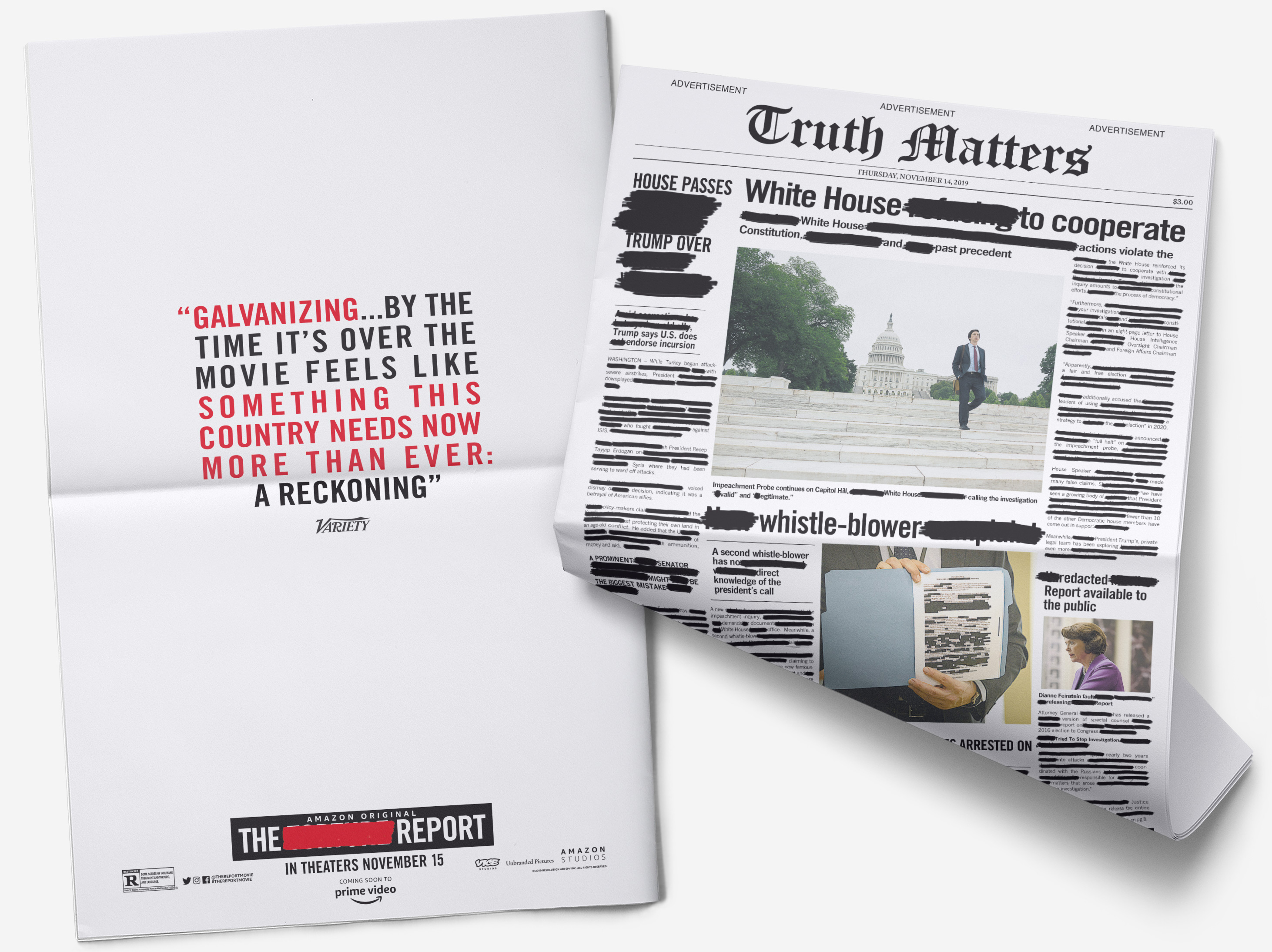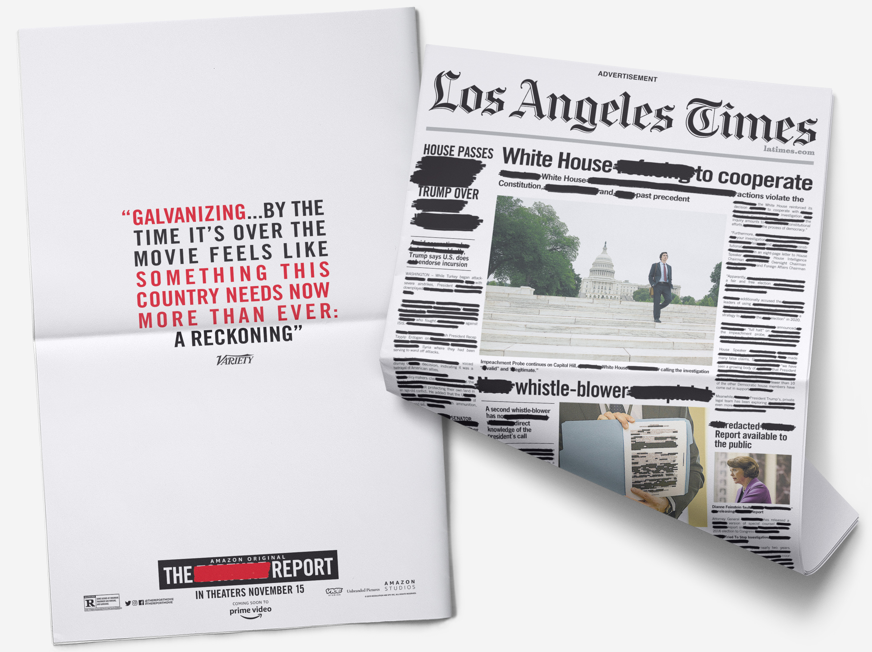 We created a massive digital and print stunt to promote Amazon Studios’ film THE REPORT.Readers encountered bars of redacted copy on the front pages of major newspapers and websites such as the Los Angeles Times, The New York Times, USA Today, The Washington Post, Fox News, CNN, The Guardian, the Boston Globe, the Chicago Tribune, the San Francisco Chronicle, the Dallas Morning News and Apple News. CIA wrote all copy for each publication, following strict editorial approvals. It was a huge success for the film and received major press buzz with write-ups in Adweekand Ad Age.