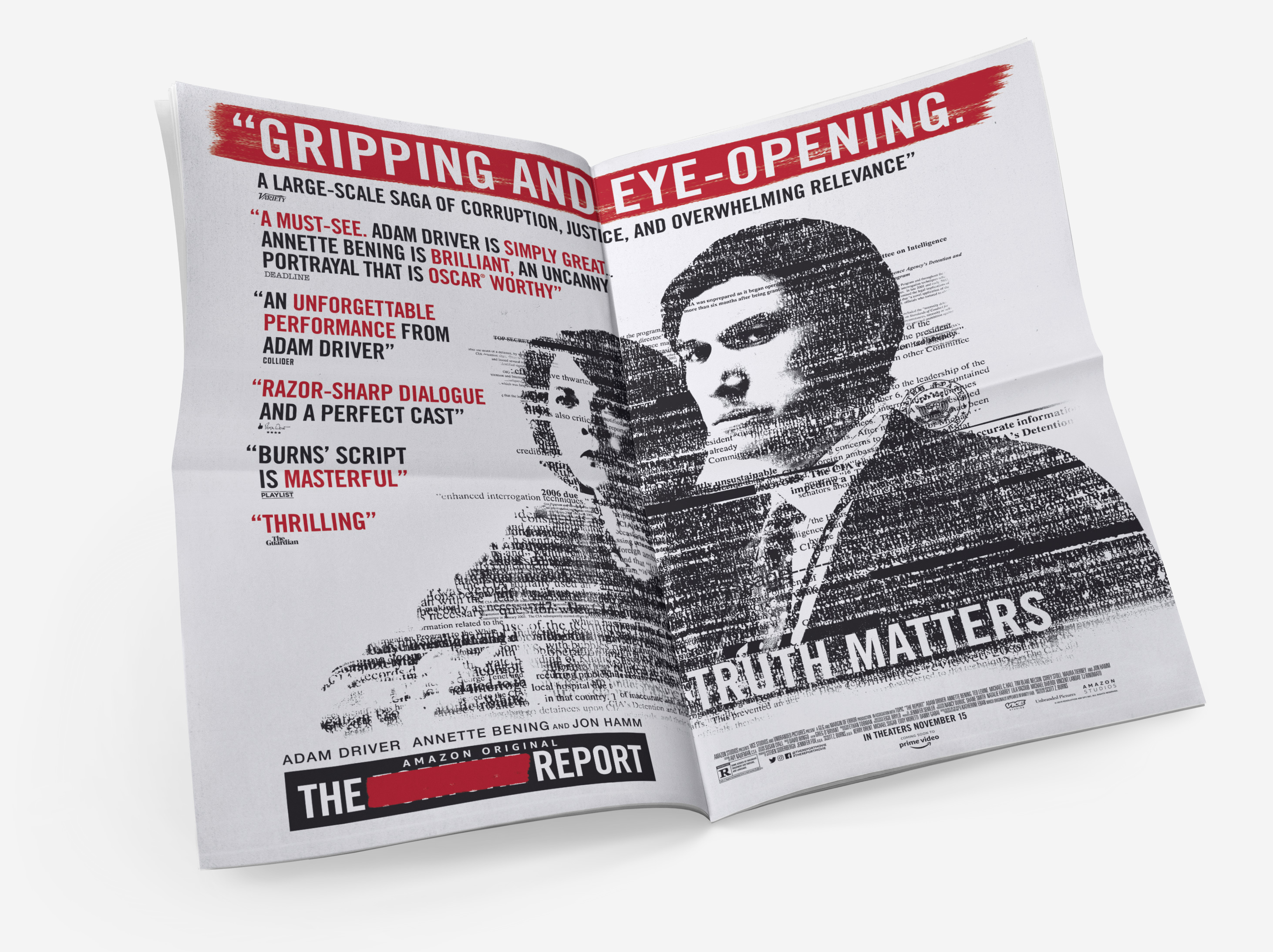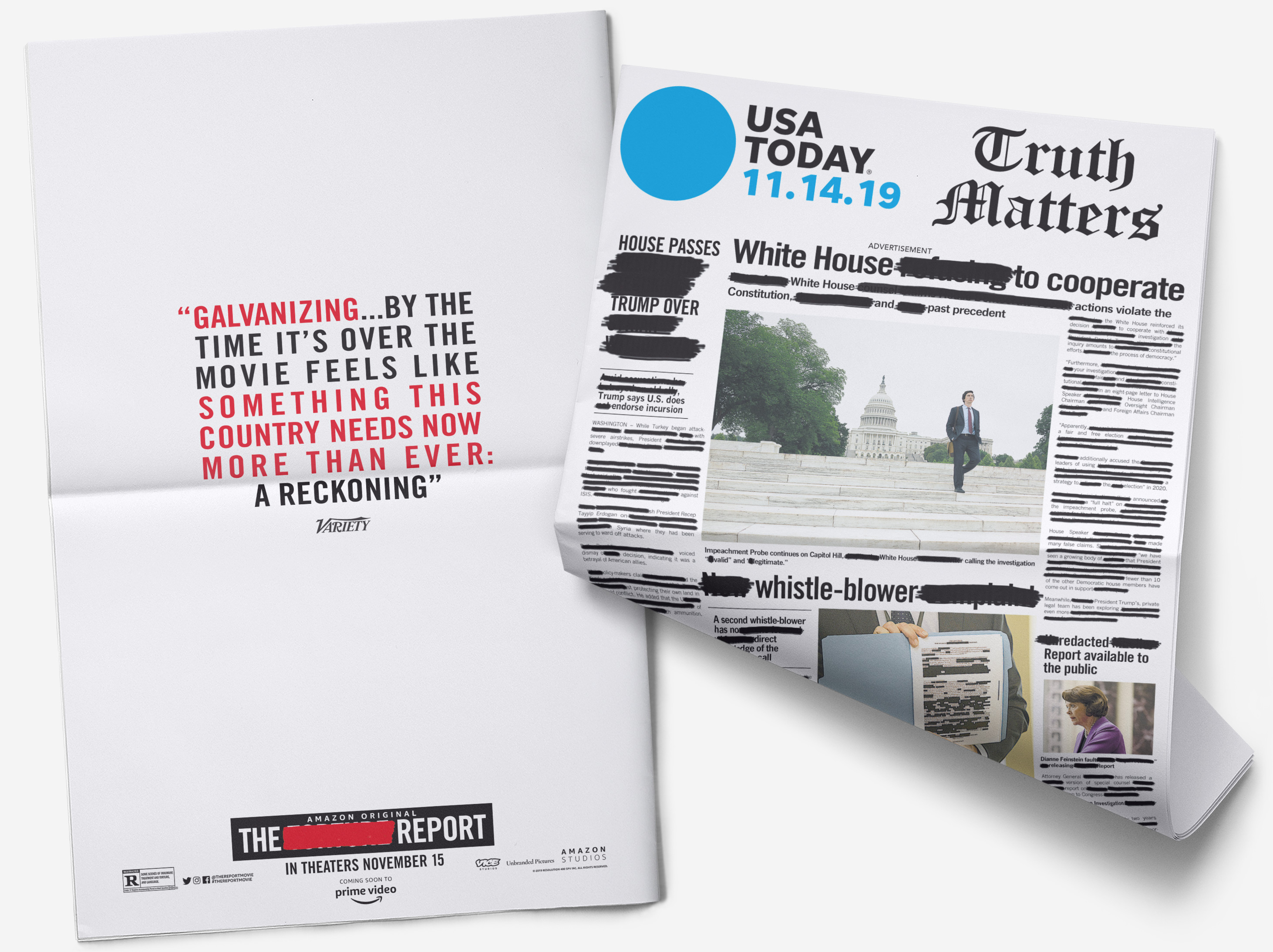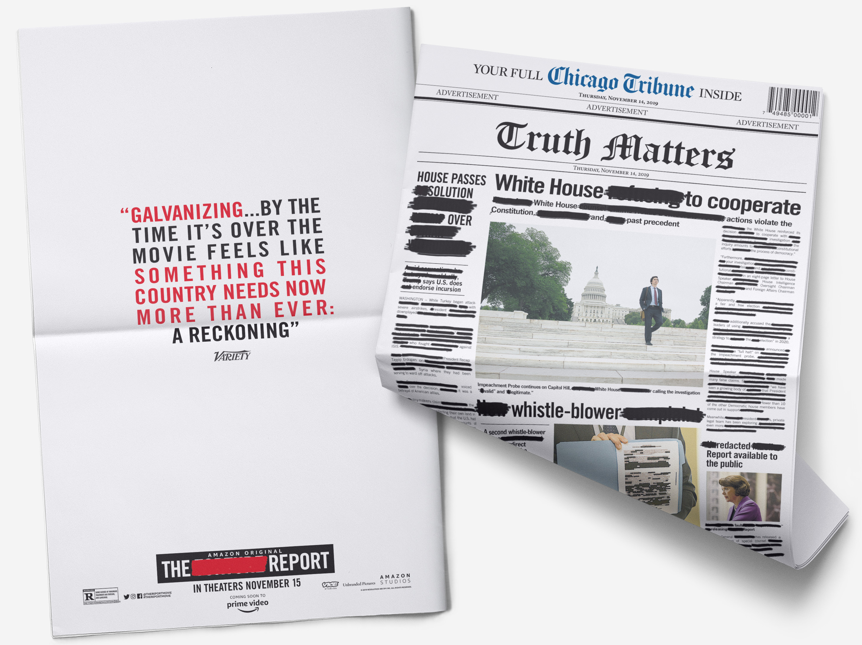 We created a massive digital and print stunt to promote Amazon Studios’ film THE REPORT.Readers encountered bars of redacted copy on the front pages of major newspapers and websites such as the Los Angeles Times, The New York Times, USA Today, The Washington Post, Fox News, CNN, The Guardian, the Boston Globe, the Chicago Tribune, the San Francisco Chronicle, the Dallas Morning News and Apple News. CIA wrote all copy for each publication, following strict editorial approvals. It was a huge success for the film and received major press buzz with write-ups in Adweekand Ad Age.